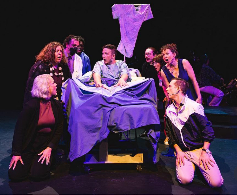 A New Brain details the autobiographical story of William Finn who had a near-death experience following brain surgery and how music played a role in his recovery: both in health and life. The show wrestles displays of reality intermingled with the fantastical world inside Gordon Schwinn’s (Morgan Coughlan) mind, which are plagued by hallucinations of a children’s television host, Mr. Bungee (Yazan Jaouni)