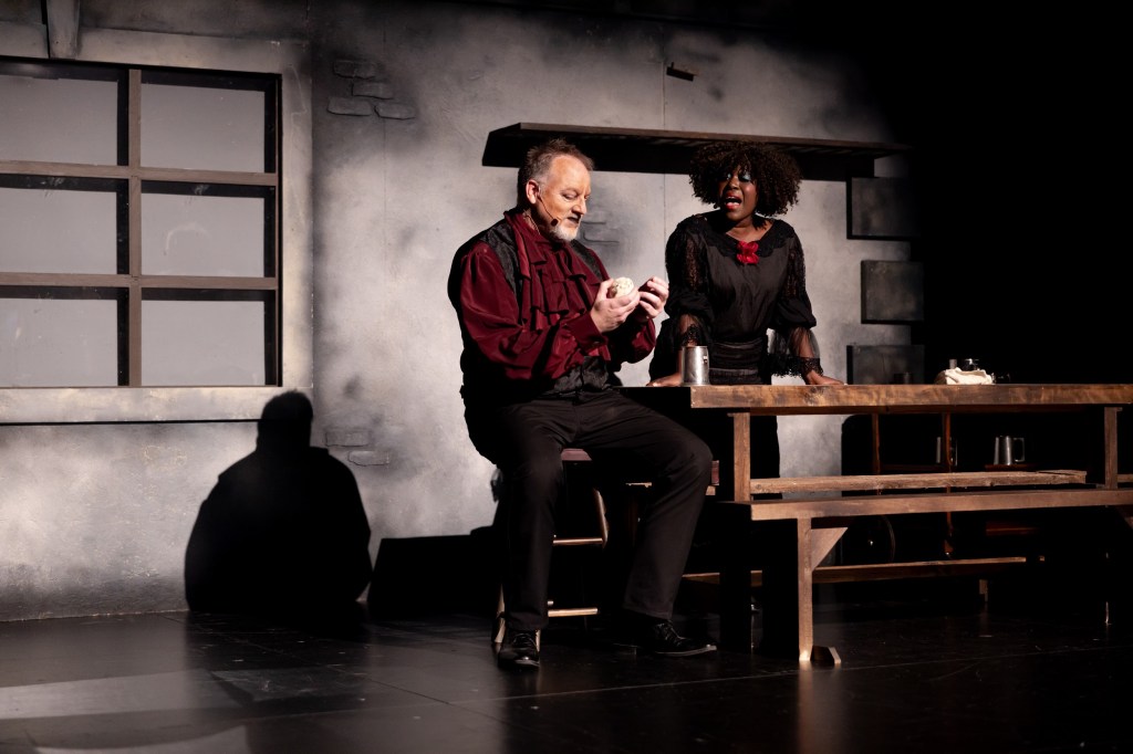 The one moment of good blocking and choreo that I did witness was during “A Little Priest”. Mrs. Lovett (Joy Mwandemange) and Sweeney Todd (Peter Graves) did an excellent job of having an almost give and take, playful tango during the number. It by far was the best moment in the show and something I wish I saw more throughout the show.